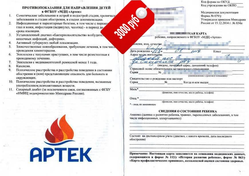 Медицинская справка для лагеря Артек содержит следующие данные: